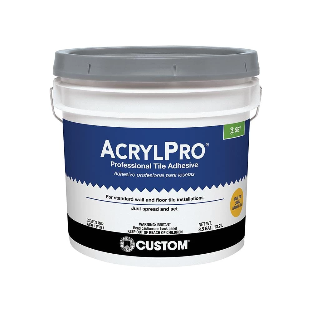 AcrylPro Professional Ceramic Tile Adhesive is a professional formula adhesive with high bond strengths. Ideal for small format ceramic, mosaic, porcelain and most gauged stone tile on walls or floors, AcrylPro may be used in areas with intermittent water exposure such as tub surrounds and shower walls. Recommended for tile up to 8″ (20 cm) on any side. Can be used with tile up to 15″ (38 cm) on any side but dry time significantly increases. For tile with any side greater than 15″ (38.1 cm), CUSTOM recommends using a polymer modified cement mortar specifically designed for setting large format tile.