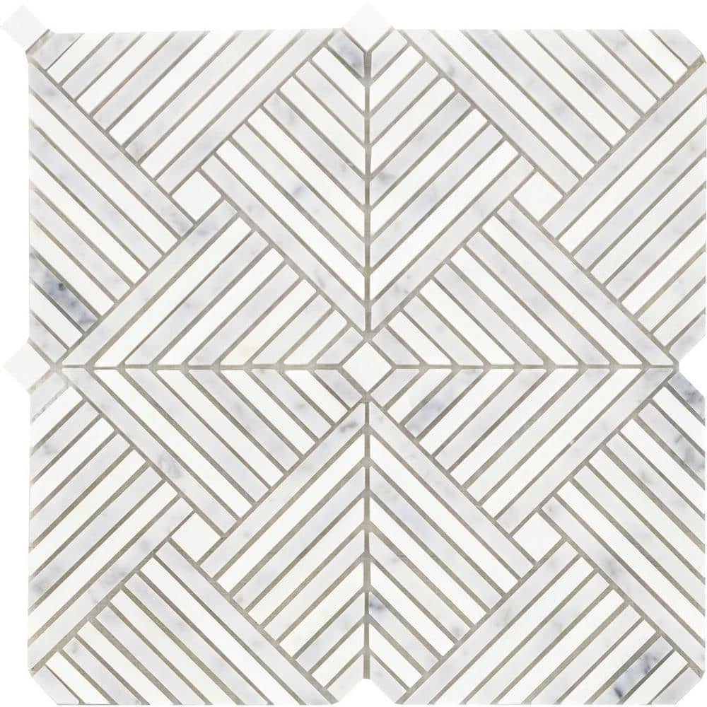 Alluro is a modern re-creation of parquet style design, using a variety of unique and eye-catching marble mosaics. Available in multiple shades of white and silver, Alluro is a fresh take on a traditional marble look. Available in 9″ x 9″ and 12″ x 12″ sizes.