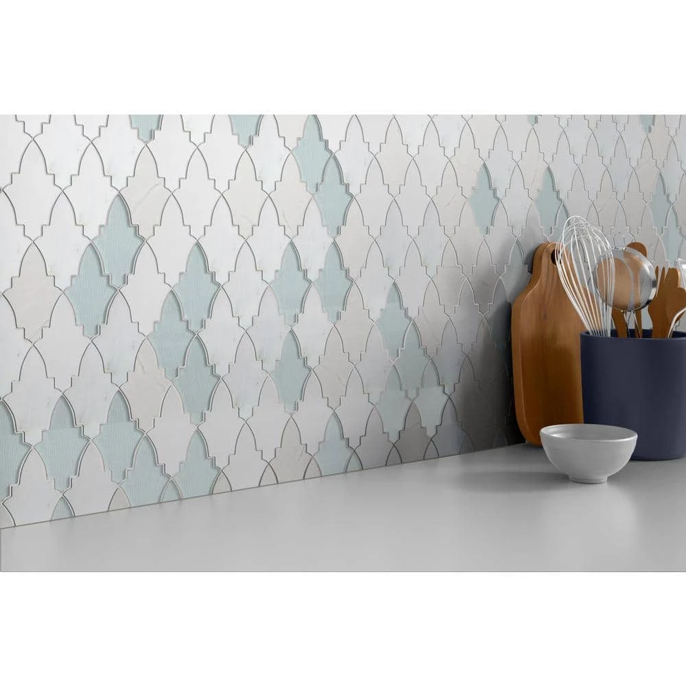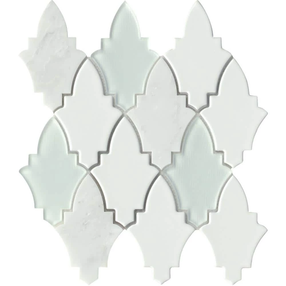 The French word for flower, Fleur is a stately mosaic combining stone, ceramic and glass. Available in 5 neutral shades, from cool white to soft blues, this mosaic will create an elegant wall feature. Choose blue tones with marble, or a tan color collection with stone accents. The 11 in. x 12 in. mesh backed mosaic makes an elegant statement in kitchens, bathrooms, entryways, or any space in both residential and commercial settings. The design possibilities are endless.