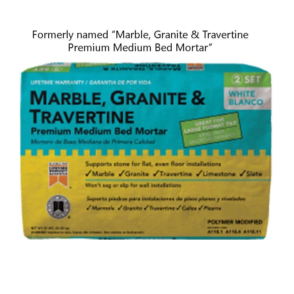 Custom Building Products Natural Stone and Large Tile Premium Mortar is a premium quality, polymer-modified mortar for any size natural stone or large format ceramic or porcelain tile 15 in. (38 cm) or larger on one or more sides. This mortar can also be used to install clay pavers or for medium bed applications. With a non-slumping formula that reduces the chance for lippage and promotes level tile installations, the mortar can be applied for horizontal applications as thick as 3/4 in. (19 mm) or for thin bed applications to 1/4 in. (6 mm).