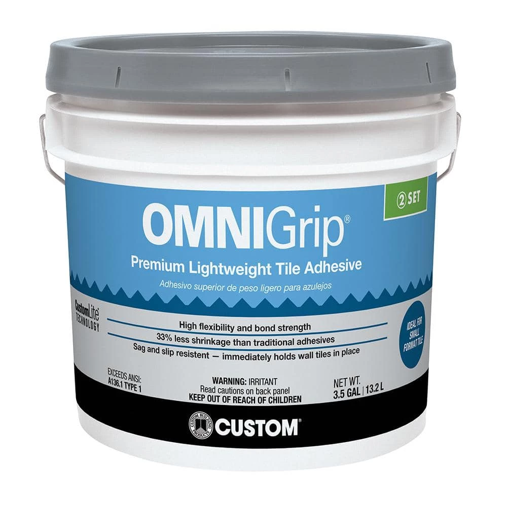 OmniGrip Adhesive is a flexible, lightweight, high-polymer adhesive for tile and stone installation. Designed to resist intermittent water exposure and has 33% less shrinkage than traditional adhesives, as well as sag resistance. Ideal for small format for ceramic, mosaic, quarry, pavers, gauged slate, porcelain and gauged stone tile installations on walls, floors or countertops. Recommended for tile up to 12 in. (30.5 cm) on any side. Can be used with tile up to 15 in. (38.1 cm) on any side but dry time significantly increases. For tile with any side greater than 15 in. (38.1 cm) CUSTOM recommends using a polymer modified cement mortar specifically for large format tile.