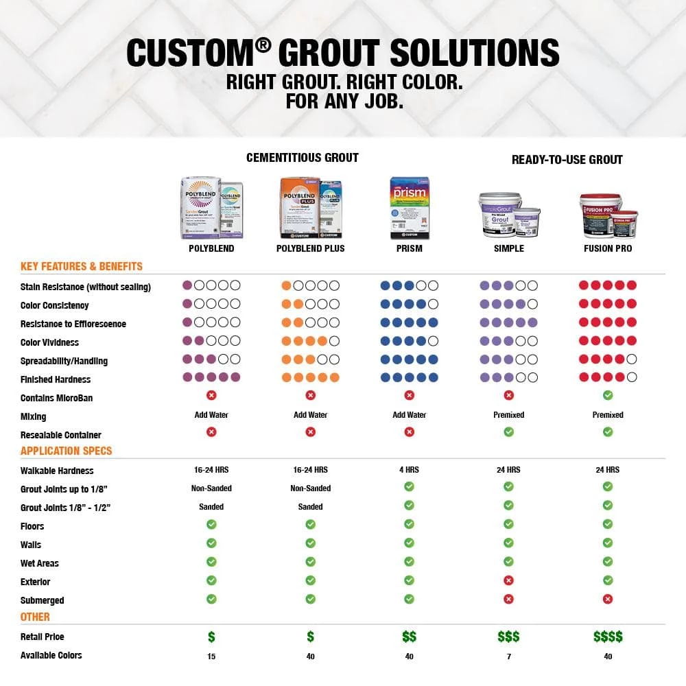 - Sample colors shown may vary from actual grout; final installed shade can differ based on tile type, porosity, job site conditions and finishing techniques