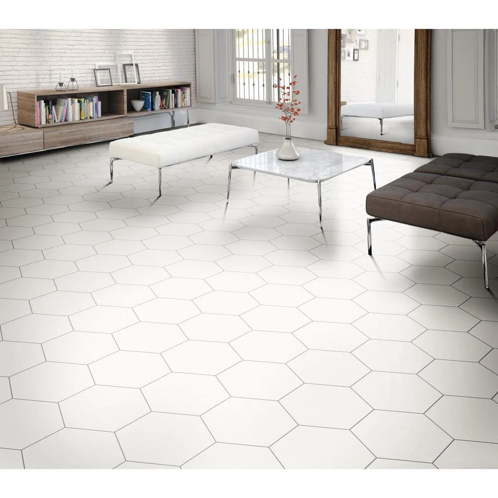 Rhythm will create a stunning look for your space with its geometric shape and unique design detail. Available in black, white, or patterned designs, Rhythm brings new life to the traditional hexagon and is ideal for any room in the home, office or commercial location. This 11 in. x 13 in. matte porcelain floor and wall tile comes alive when the raised pattern tiles are mixed throughout or make a bold statement by combining the white and black tiles together. No matter what you decide, you are sure to enthrall your friends, family and associates by creating a truly memorable and high-end look.
